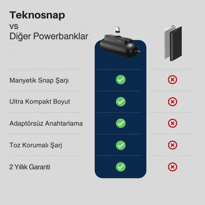 Kablo, ağırlık ve yer kaplayan powerbank’lere veda et. Teknosnap, kompakt yapısı ve manyetik bağlantısıyla şarjı zahmetsiz, hızlı ve her an hazır hale getirir.